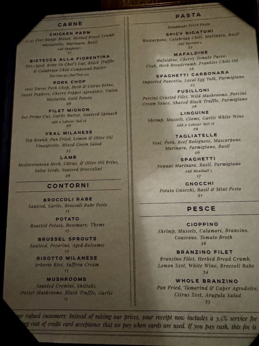 When it comes to the Carne (meats), the restaurant excels with classic Italian preparations. The Chicken Parm is a crowd favorite, offering tender chicken smothered in marinara and cheese. The Bistecca Alla Fiorentina comes in two sizes-For One or For Two, ensuring a generous and flavorful steak experience. The Pork Chop and Filet Mignon are also must-tries for meat lovers, each cooked to perfection with a tender, juicy finish.